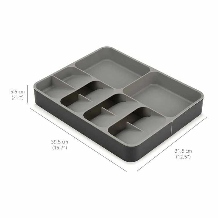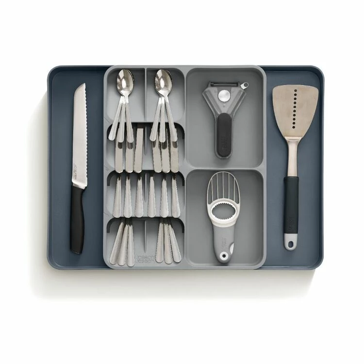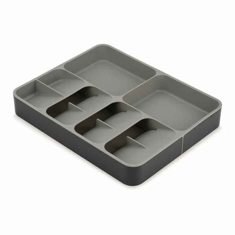 The Joseph Joseph Drawerstore Grey Cutlery Utensil And Gadget Organiser will help clean up your messy utensil and cutlery drawers with this practical and smart storage solution. This unique tray combines five overlapping compartments for storing cutlery with three deep-sided compartments for holding utensils and gadgets. What is usually stored in two drawers can now be neatly organised into one, creating more space in your kitchen.