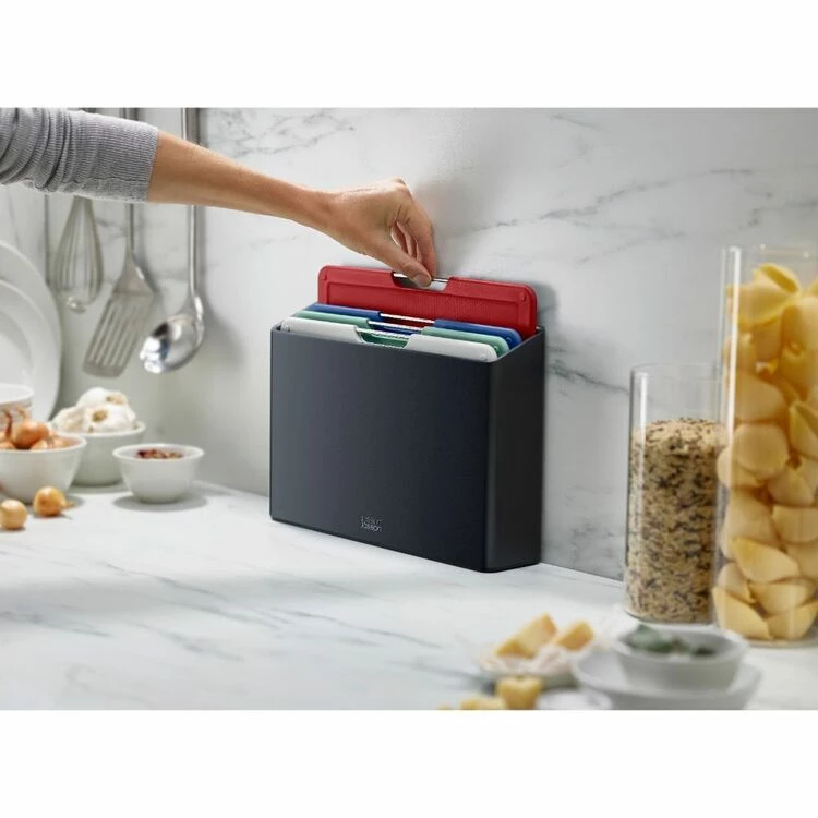 The Joseph Joseph Folio 4 Pc Board Set Regular include 4 regular-sized cutting boards and a slimline case for compact and organised storage. The tiered design and stainless-steel bars on the boards allow you to easily choose the board that you need. The textured cutting surfaces and non-slip feet make it very knife friendly and give you that peace of mind when prepping ingredients.