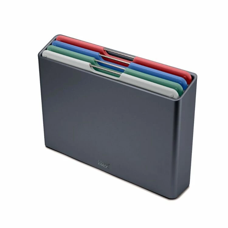 The Joseph Joseph Folio 4 Pc Board Set Regular include 4 regular-sized cutting boards and a slimline case for compact and organised storage. The tiered design and stainless-steel bars on the boards allow you to easily choose the board that you need. The textured cutting surfaces and non-slip feet make it very knife friendly and give you that peace of mind when prepping ingredients.