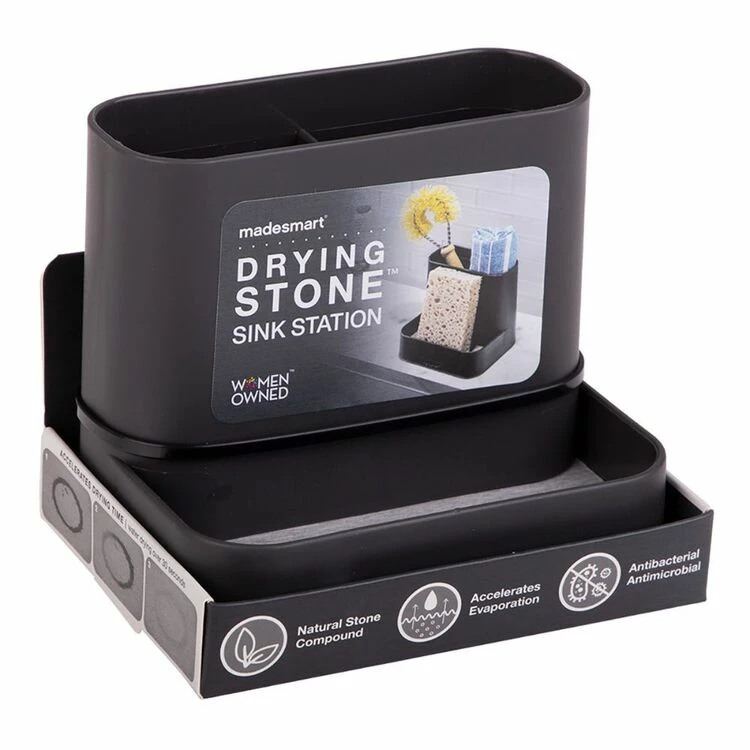 The Madesmart Drying Stone Small Sink Station aids in kitchen sink organisation with style and efficiency. This 3-compartment sink station is constructed of high-quality plastic and non-toxic, naturally occurring materials with antimicrobial and antibacterial properties. Its absorbent, mineral-based material is designed to accelerate the evaporation of moisture eliminating germs while improving the hygiene of sponges, dish wands, and scrub brushes. If water-logged, detach for easy cleaning and drying before using again.