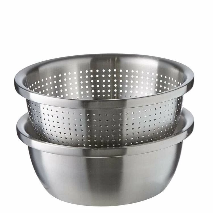 304 stainless steel colander with bowl set of 2. Kitchen strainer, washer, drainer basket with basin for vegetable, fruits, pasta, salad mixing, food prep.
