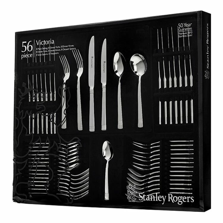 Set contains formal place setting for eight: 8 Dinner Knives, 8 Dinner Forks, 8 Entree Knives, 8 Entree Fork, 8 Dessert Spoons, 8 Soup Spoons, 8 Teaspoons